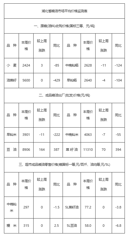 (一)稻价弱势震荡。本周,全省中晚籼稻收购均价2628元/吨,较上周下跌11元/吨,中晚籼米出厂均价4063元/吨,周环比下跌7元/吨;早籼稻收购价2640元/吨,周环比下跌4元/吨,早籼米出厂价3901元/吨,较上周下跌11元/吨。本周省内稻价运行稳中趋弱,不少企业正在清仓腾库,迎接新季中晚籼稻上市。目前,随州地区丰两优1.28元/斤(折国标三等价格,下同),优质稻珠两优5298品种1.40-1.42元/斤;荆州公安县少量早熟中稻开始零星上市,开秤价1.25元/斤左右,主要流向当地小米厂。据沙洋某规模型大米加工企业反映,近期该企业组织了在田新稻品质抽测,抽测样品出米率达65%左右,品质明显优于上年。另据了解,这段时间省内部分收储企业正在加大陈稻轮出力度,腾出仓容备战即将上市的中晚籼稻,市场上流通粮源充裕令稻价略显承压。预计新稻上市之前,我省稻谷价格将维持弱势震荡。